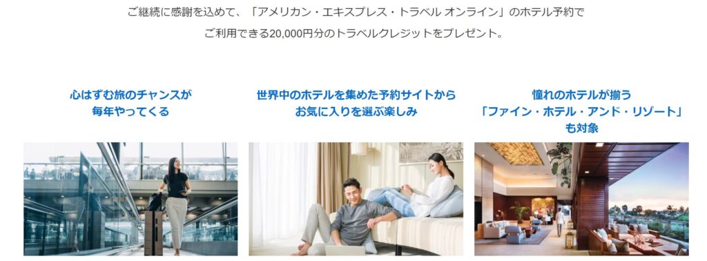 毎年、アメックスプラチナカードを更新の都度、トラベルクレジット20,000円分がもらえます。