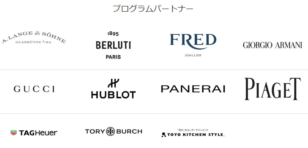 2023年9月時点のプログラムパートナーブランドは、GUCCIなど上記11ブランドですが、今後も様々なブランドが参加予定です。