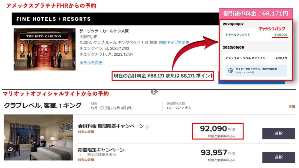 上のキャプチャーの上段がアメックストラベルオンライン(F・H・R)を利用した予約で、20,000円キャッシュバックを適用して予約しました。