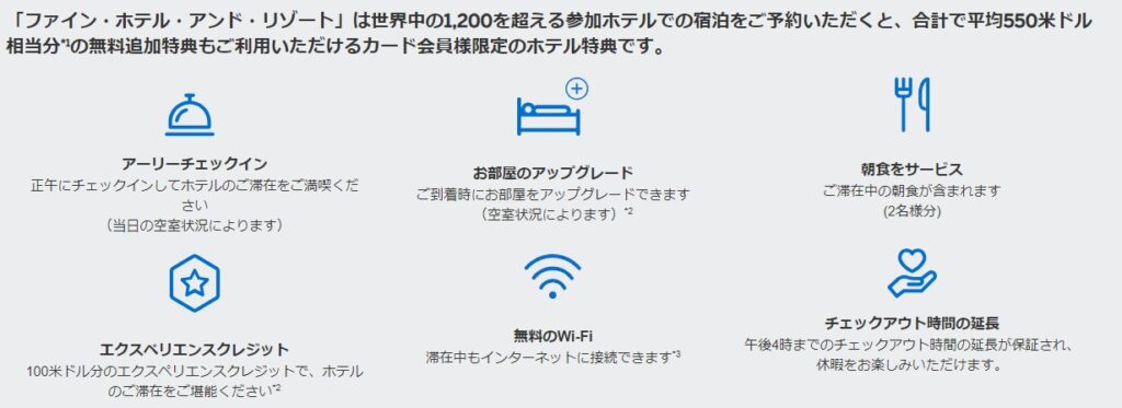 さらに、ただ単に料金が安いだけではなく、アメックストラベルオンライン(F・H・R)の予約は、トラベルクレジット100米ドル分、朝食無料、レイトチェックアウト16:00確約などの特典も付いています。