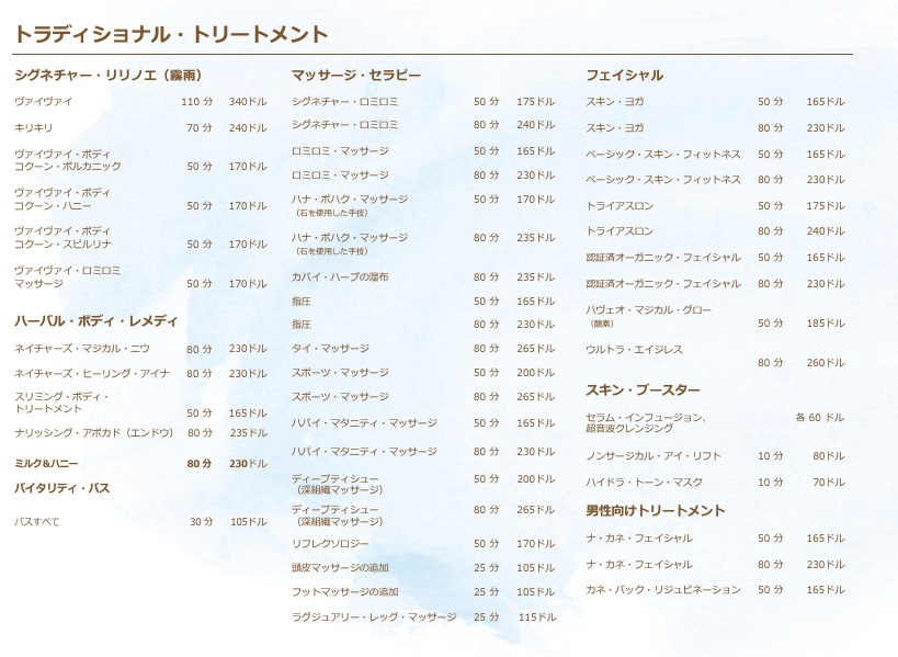 現在のメニューには、ロミロミマッサージとシグネチャーロミロミの間のもう一つプランがあるので(ハナ・ポハク・マッサージ)予約される際は確認をしてください。