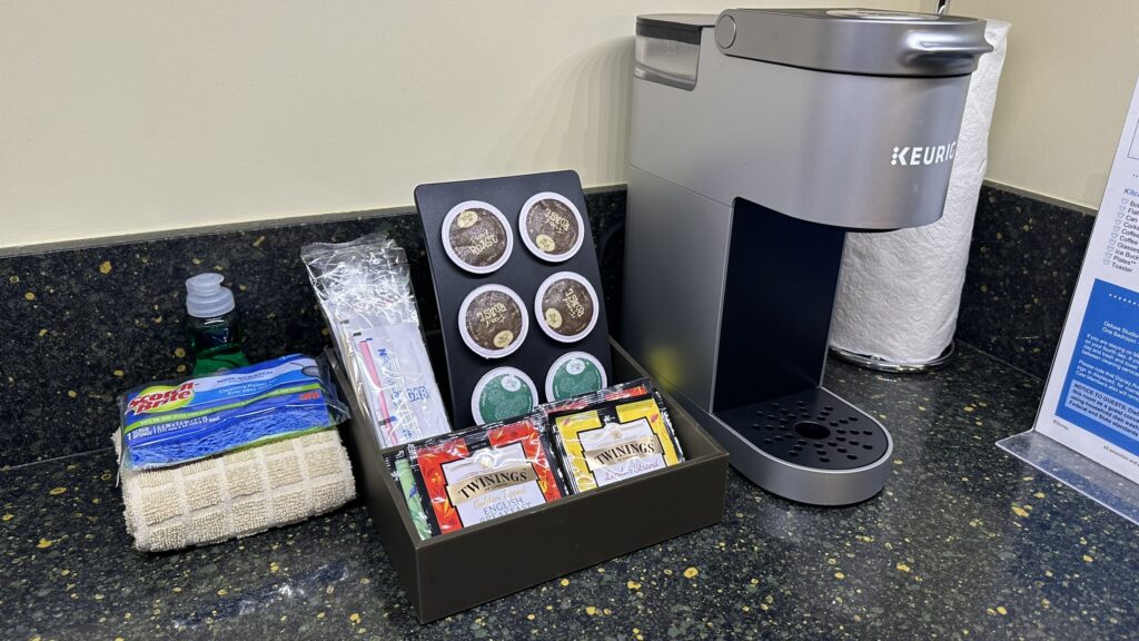 フリードリンクとスイーツ・果物がおいてあり、ゆったりしながら小腹も満たせます。