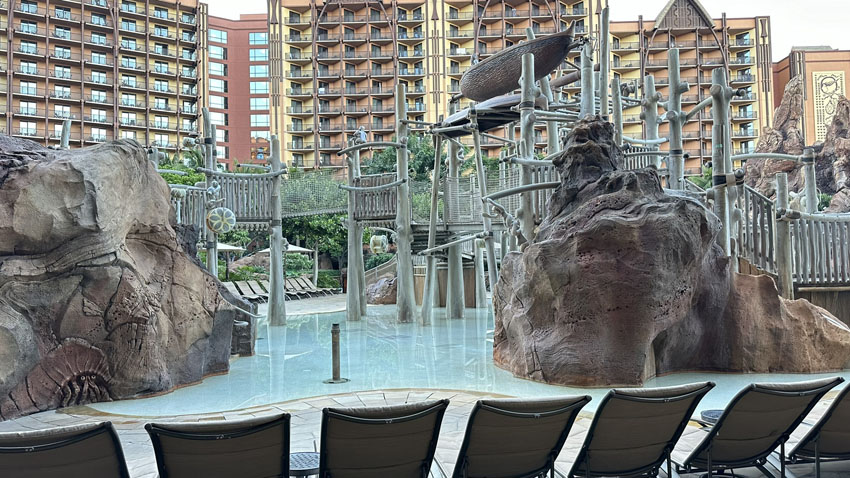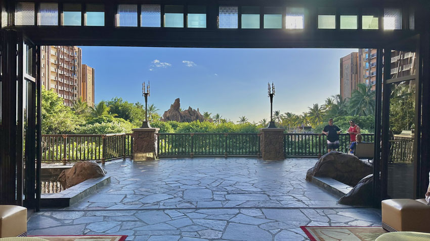 ロビーをそのまま正面奥まで進むと、アウラニ・ディズニー・リゾートの中庭&プールを見渡すことができます。
