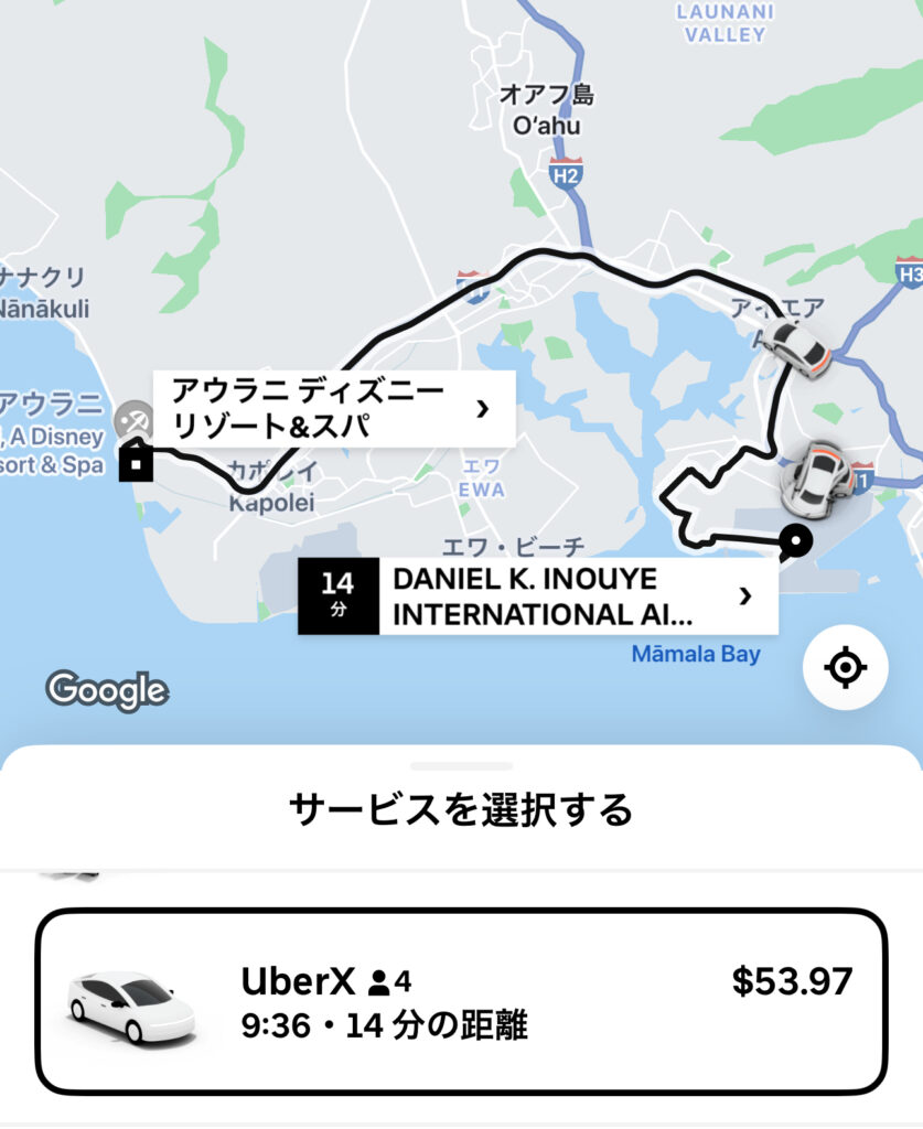 ちなみに、ある日の現地時間13:30にホノルル空港からアウラディズニーリゾートまでの送迎を検索すると$53.97で出てきました