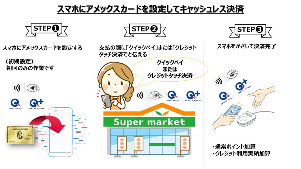 アメックスゴールドプリファードは、QUICPAYやクレジットカードのタッチ決済に対応しているため、スマホを持っている人は必ず登録して、スーパーやコンビニ等での決済をQUICPAYで決済するようにしましょう。