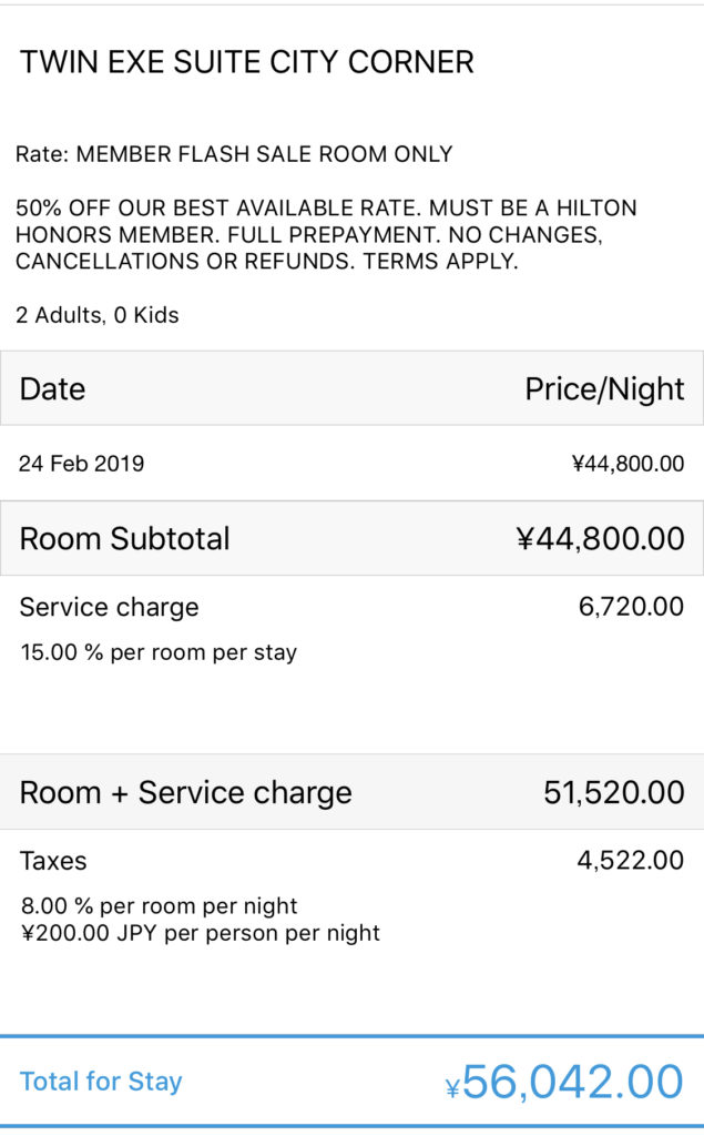客室料金が44,800円で、これにサービス料15%と消費税8%、宿泊税200円が加算されて、最終的に支払った料金は56,042円でした。