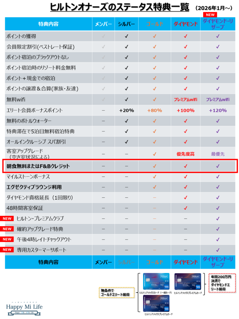 | ヒルトン・オナーズ・ダイヤモンドステータス | なし | 年間200万円以上利用でステータス獲得 |