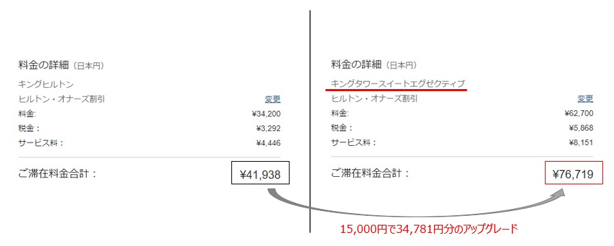 上のキャプチャーはある週末の料金ですが、サービス料・消費税込みの料金で、ヒルトンルームが、41,938円、タワースイートが76,719円でした。本来、34,781円の差額料金が発生するのですが、15,000円のみでアップグレードできたことになります。このアップグレード料金もダイヤモンドエリートの特典とのことでした。