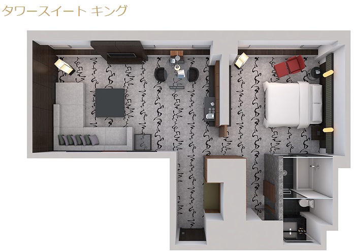 今回、追加料金15,000円を支払ってアップグレードして頂いた客室は、『タワースイートキングルーム』でヒルトン東京で最もランクの高い客室でした。もともとの予約はヒルトンポイントを利用して最もスタンダードな客室を予約していたので、一番下のランクから一番上のランクにアップグレードされたことになります。