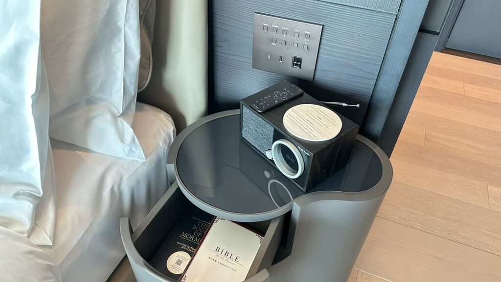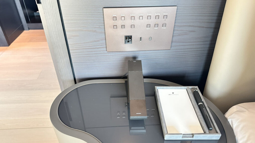 ベッド横のテーブルには、スピーカーや電話機のほか、客室の照明やカーテンを操作するボタンが並んでいます。
