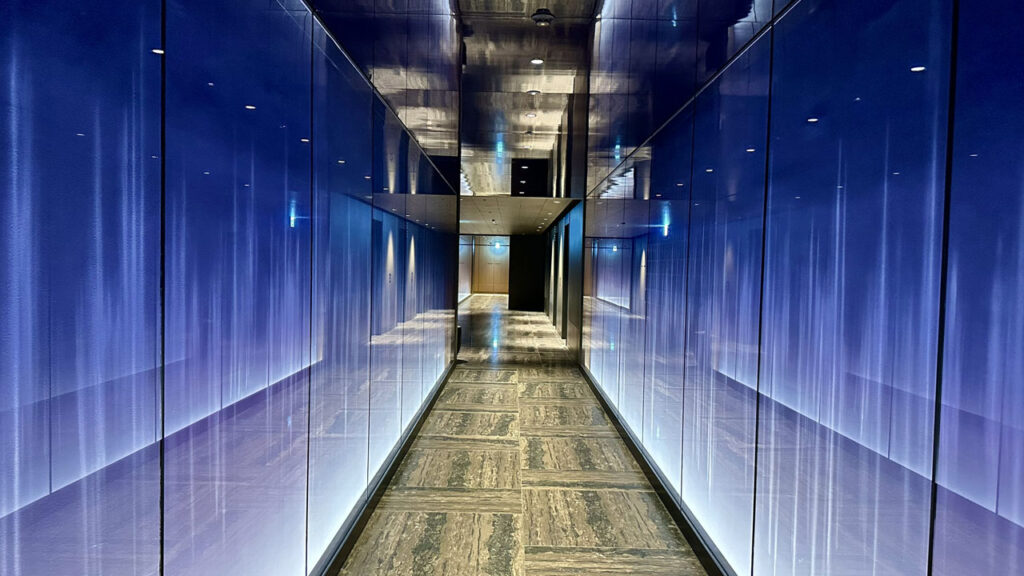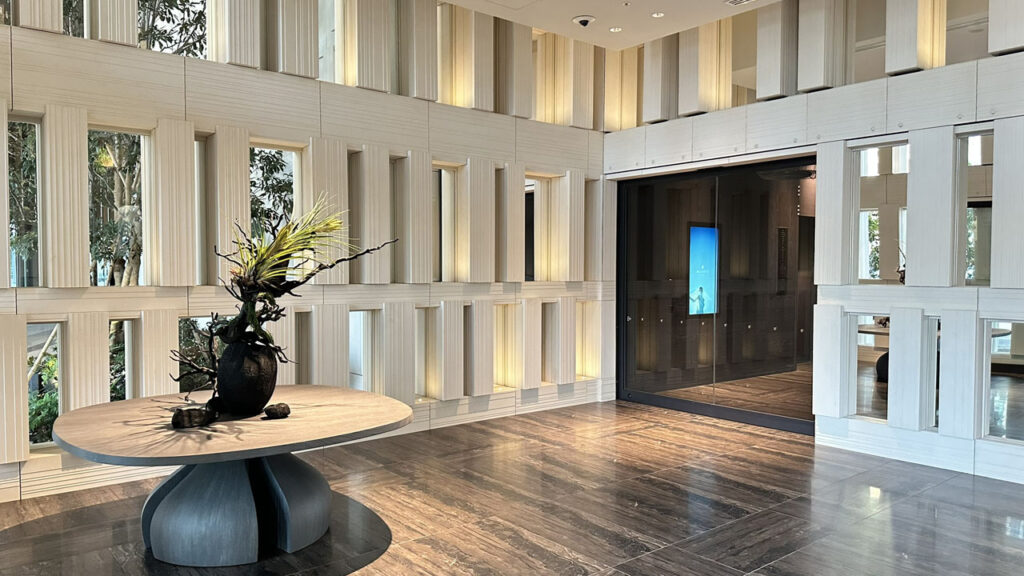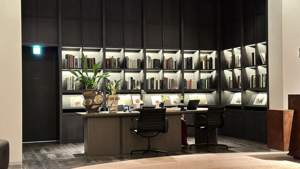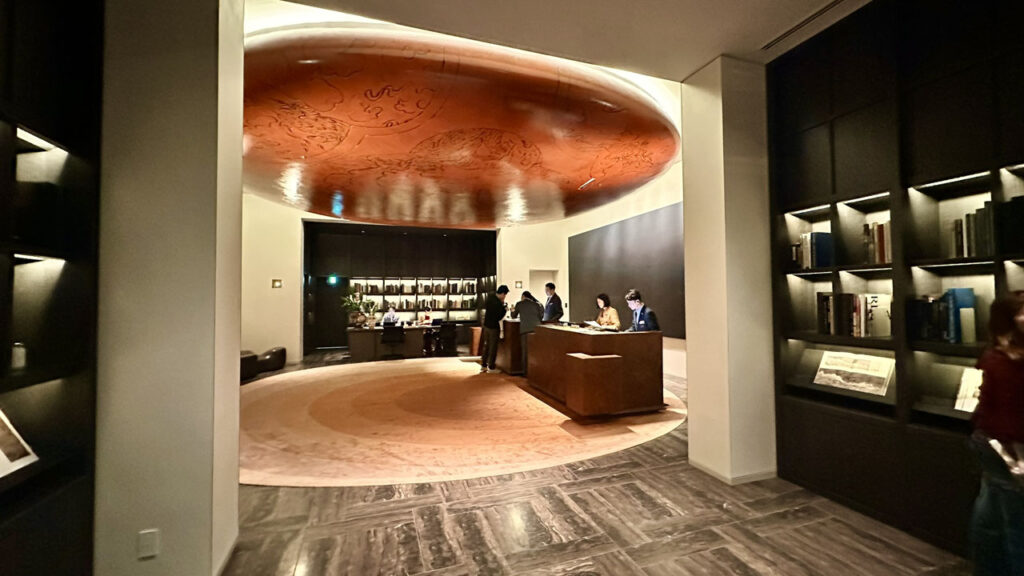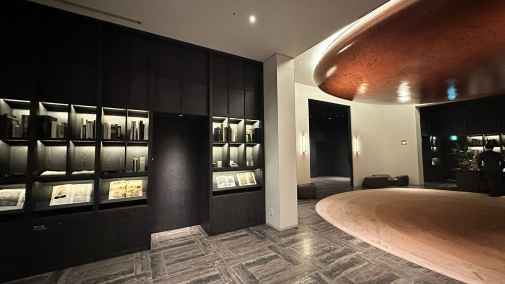 レセプションエリアは、かつてこの地域が海や丘陵が美しい景勝地だったことを示す作品や、和工芸の技法を現代的に解釈した意匠が並び、ホテルが立つ土地そのものの物語性を空間で語る設計 が印象的。