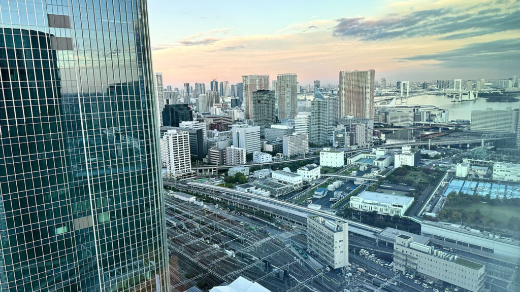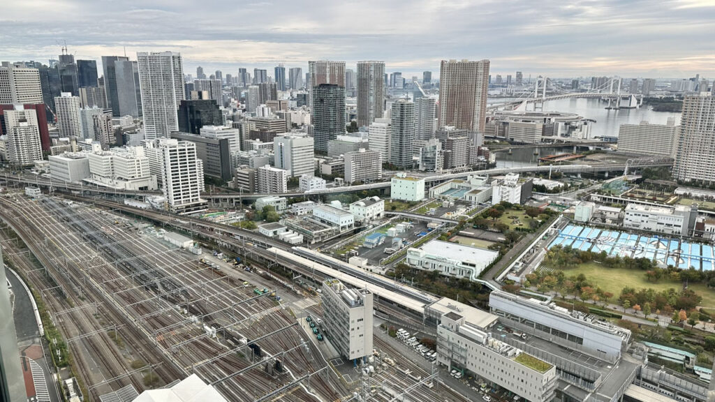 東側の窓(洗面台側)から少し覗き込む必要がありますが、高輪ゲートウェイ駅やレインボーブリッジを見ることができます。
