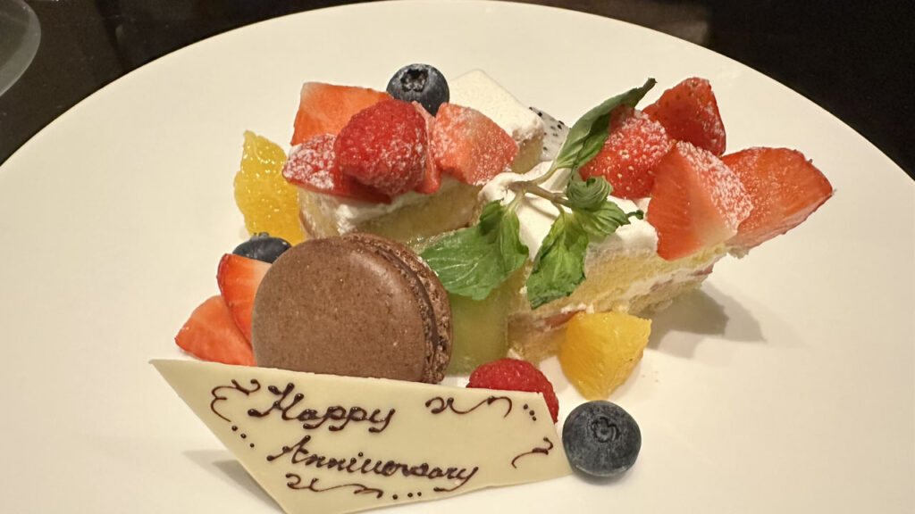 上の写真は、エグゼクティブラウンジでスタッフさんからいただいたアニバーサーリープレートです。