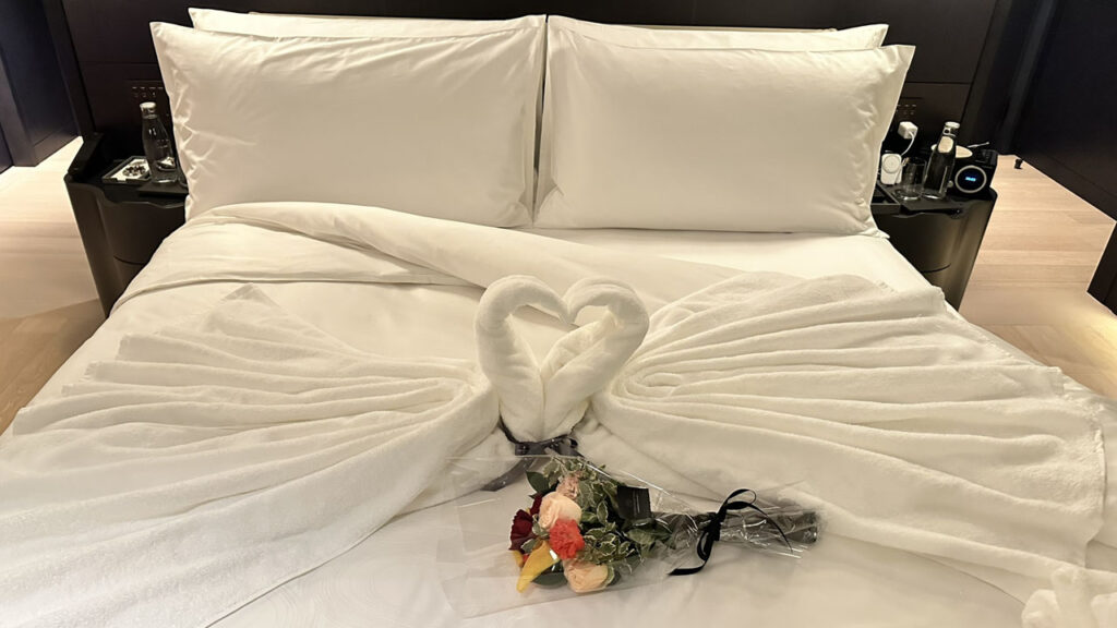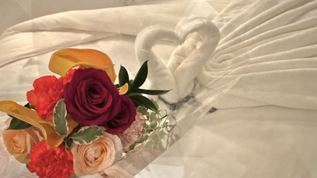 事前にホテルにお願いしてお花を準備しました。タオルアートはホテルのご厚意です。