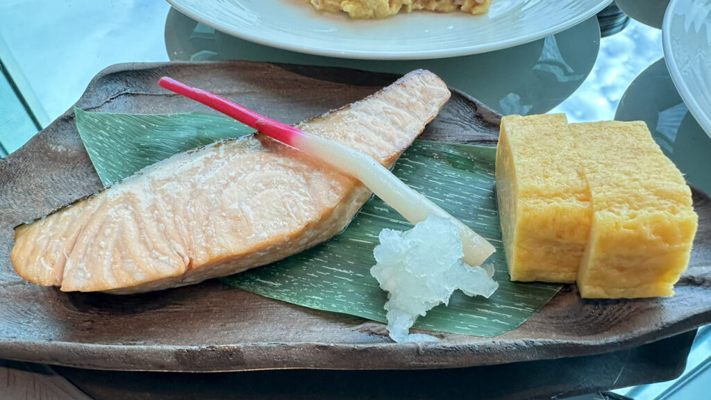 和食レストラン「華香」提供の【本日の焼き魚】をオーダーしました。この日は鮭でしたが、とても大きな切り身に出汁巻きたまごもついていて、クオリティは素晴らしかったです