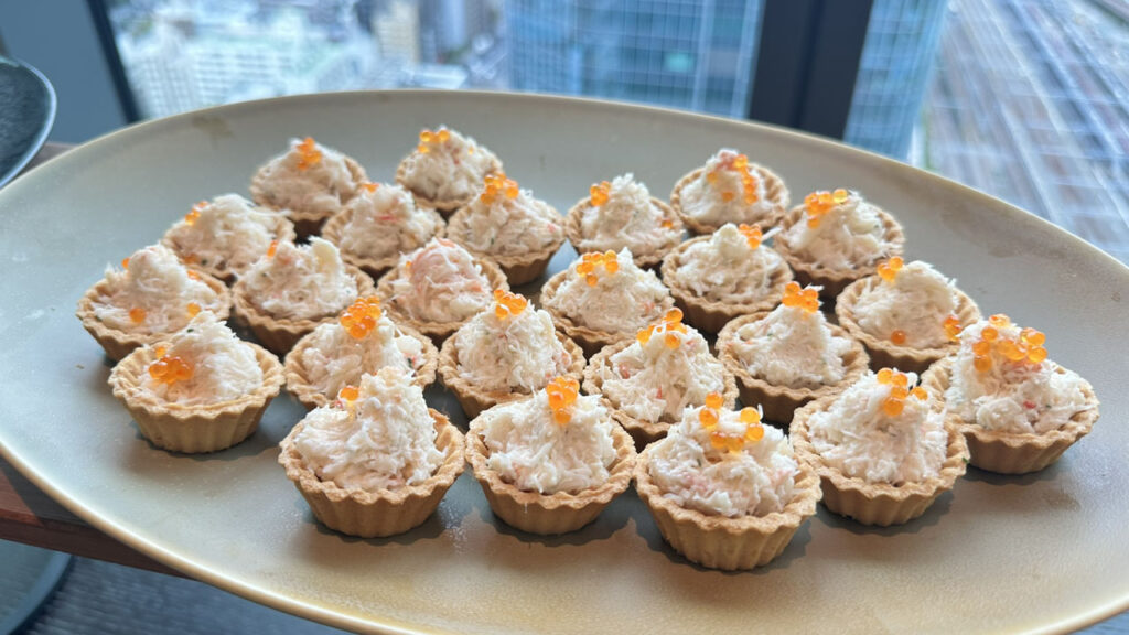 都会の動きと海の静けさが重なる、ここだけの絶景が魅力です。ラウンジは横長の設計でかなり広く、上質で落ち着いたデザインでまとめられ、時間帯ごとに提供されるフードプレゼンテーションとともにラグジュアリーな体験をすることができます。