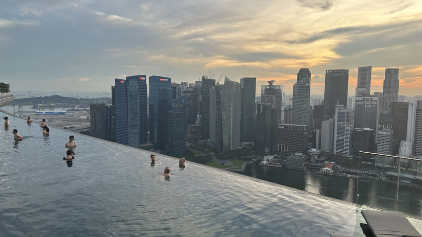 一方、マリーナベイサンズの展望デッキ(スカイパーク)は、入場料32SGDを支払って、56階(最上階ではない)の展望デッキに登り、立ち見で絶景を見ることになります。