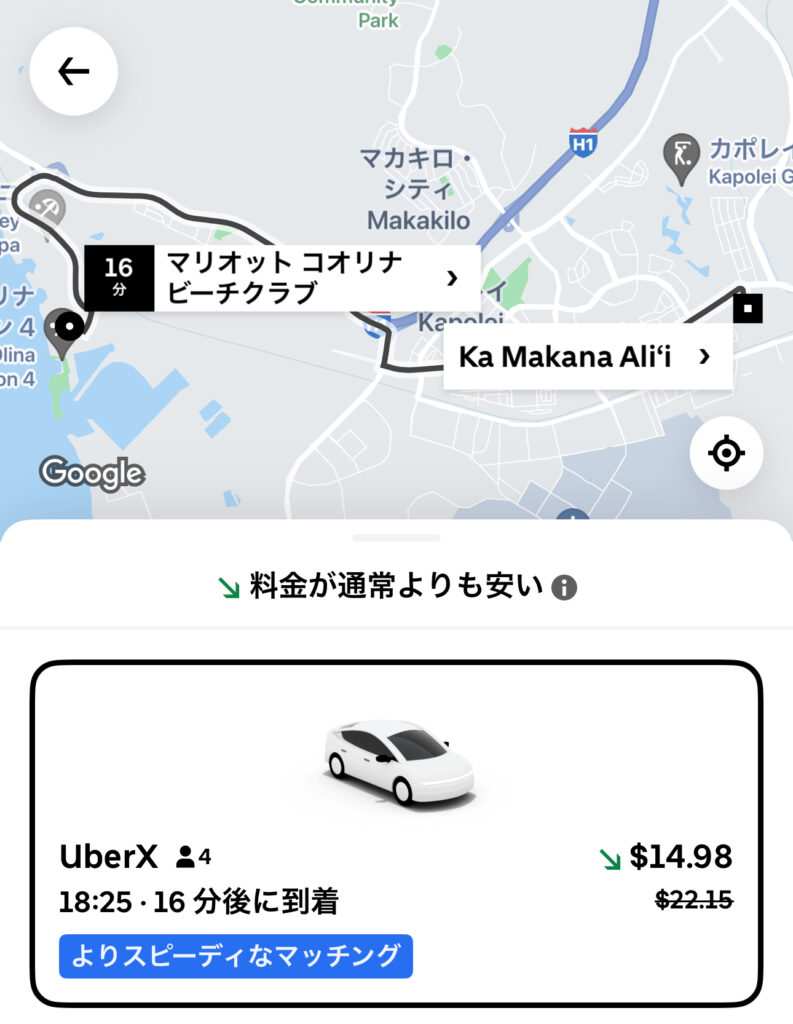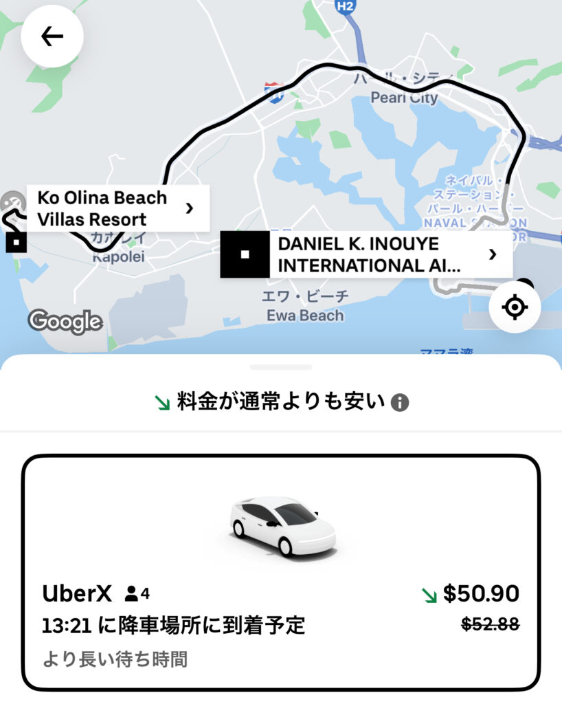 ちなみに、ある日の現地時間13:20頃にホノルル空港からコオリナビーチクラブまでの送迎を検索すると$50.90でした。