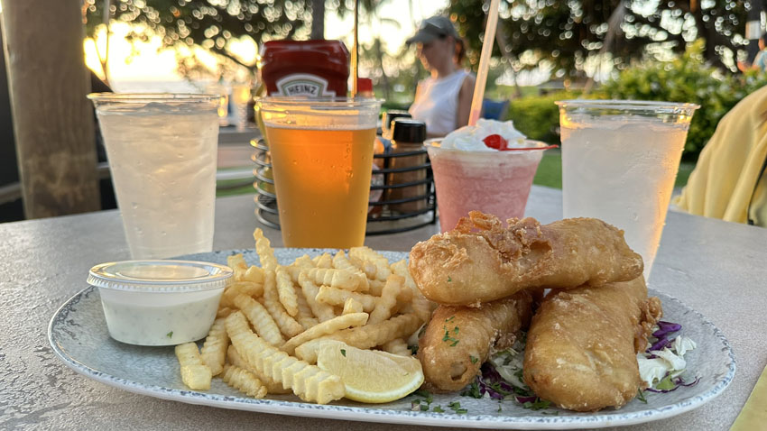 サンセットの時間にフィッシュ&チップスとビールをいただきながら至福の時間