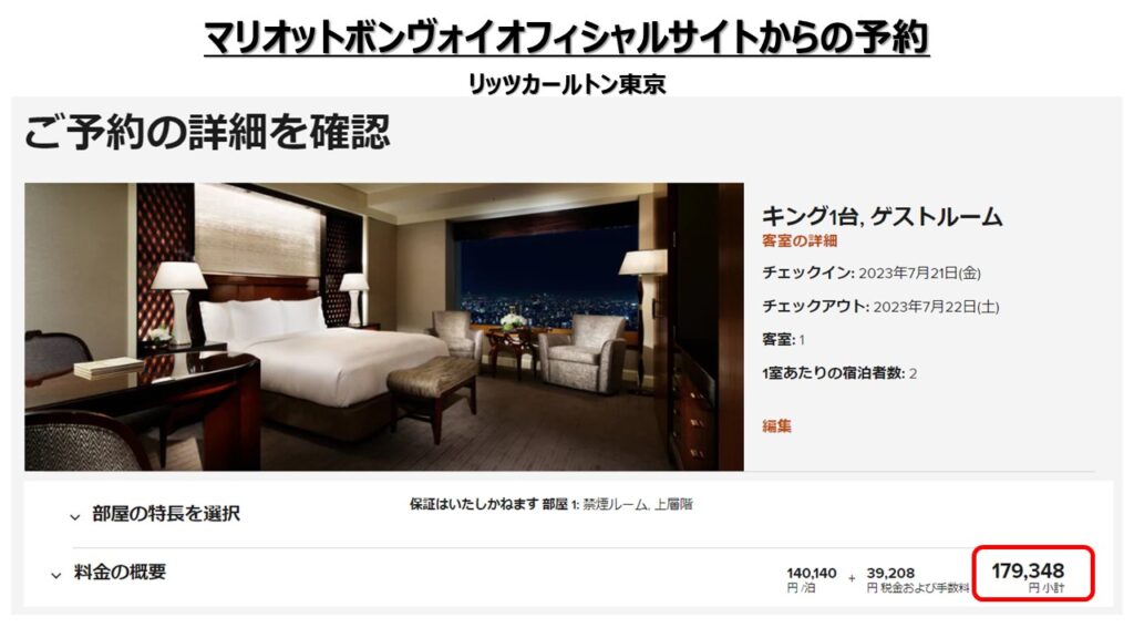 さきほどのリッツカールトン東京の例と同様で、Marriott Bonvoy会員割引、5と0のつく日で10%割引があり、マリオットボンヴォイオフィシャルサイトからの予約より低価格で予約することができました。