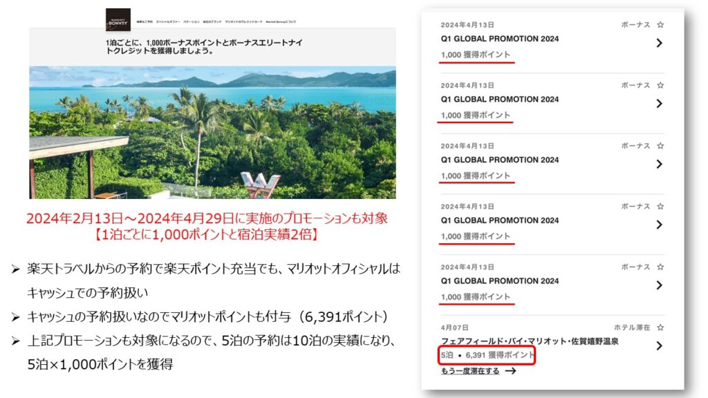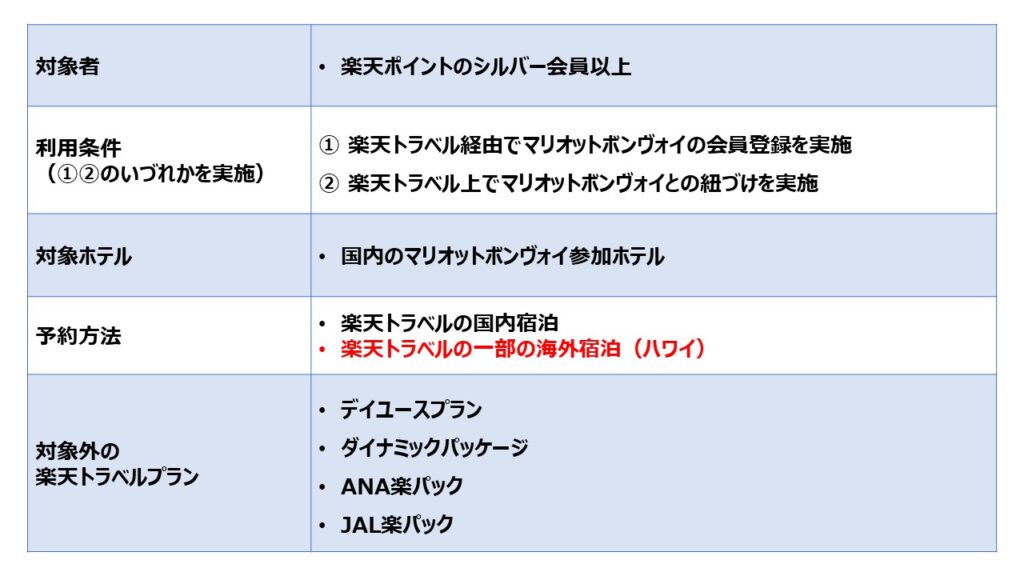 特に、楽天ポイントのシルバー会員以上、国内のマリオットボンヴォイ参加ホテルが対象の2点は重要です。