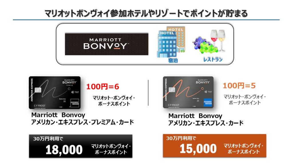 マリオットボンヴォイ参加ホテル・レストランで利用すると、マリオットアメックスプレミアムカードは、100円=6ポイント貯まり、マリオットアメックス(一般)カードは、100円=5ポイント貯まるようになります