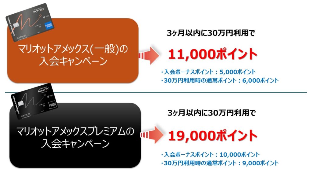 入会キャンペーンでマリオットアメックスプレミアムを30万円利用すると9,000ポイント、マリオットアメックス(一般カード)で30万円利用すると6,000ポイント貯まりますね。