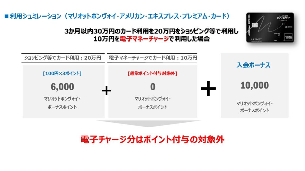 上のシュミレーションは、3ヵ月以内30万円のカード利用のうち10万円を電子マネーにチャージした場合のシュミレーションです。(マリオットアメックスプレミアムカードの例)