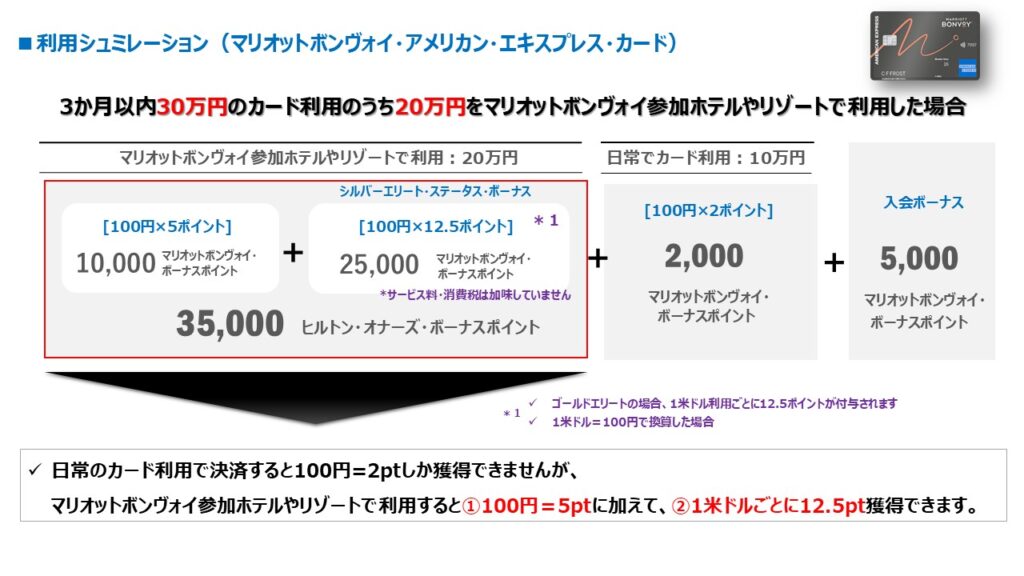 上図は、マリオットアメックス(一般)カードで3か月以内30万円の内50万円をマリオットボンヴォイ参加ホテル・レストランで利用した場合のシュミレーションです。