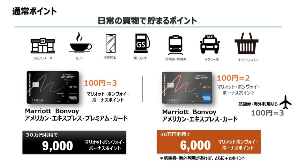 マリオットアメックスプレミアムカードは、100円=3ポイント貯まり、マリオットアメックス(一般)カードは、100円=2ポイント貯まります。