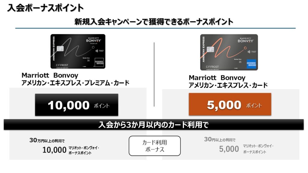 マリオットアメックスプレミアムカードの入会ボーナスは、3カ月以内に30万円利用で10,000ポイント、マリオットアメックス(一般)カードの入会ボーナスは、3カ月以内に30万円利用で5,000ポイント獲得できます。