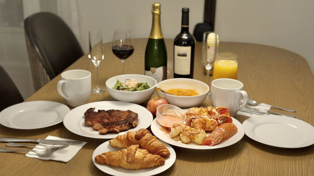 上の写真は、リッツカー・クラブ・サンフランシスコで自炊した料理です。特に物価の高い米国では食費を節約できるメリットのほか、現地の食材を現地のスーパーで調達してお料理する楽しさもあります。