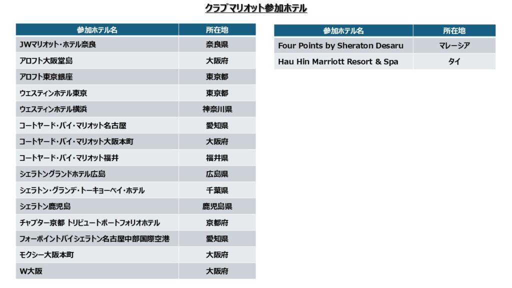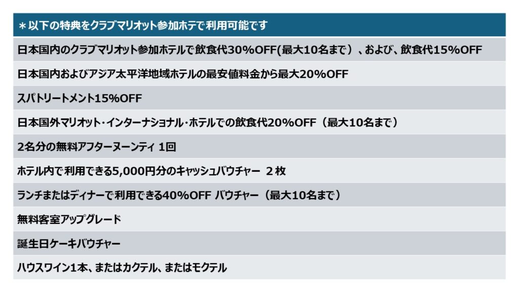 クラブマリオット参加ホテルで以下の特典が利用できます。