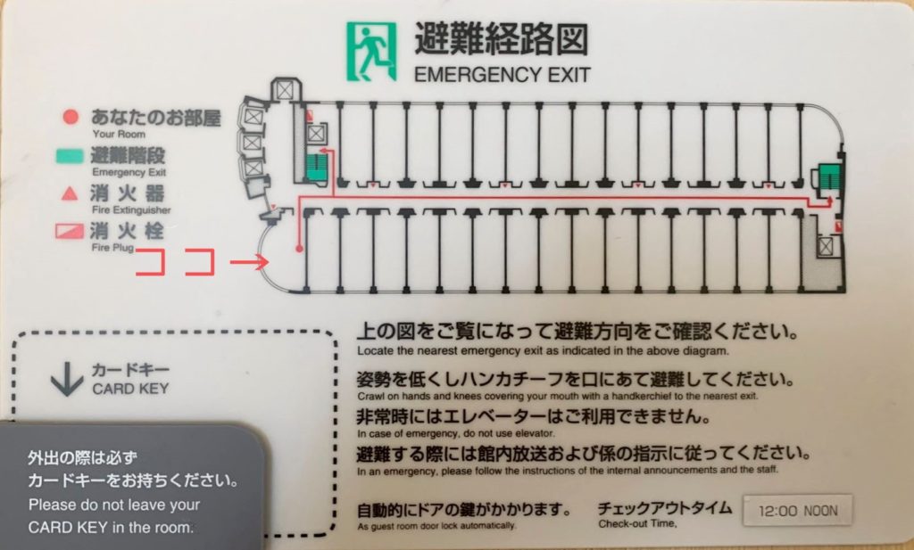 今回宿泊したの上から4つ目のお部屋、電気がついている部屋の一つ下です。