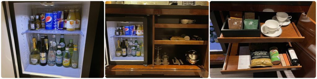 ミニバーの内容や冷蔵庫の中身は、デラックスルームの客室と違いはないと思います。