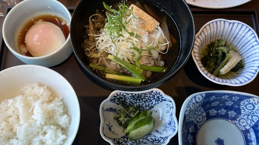 セットには、白御飯、半熟たまご、小鉢、お漬物がついています。