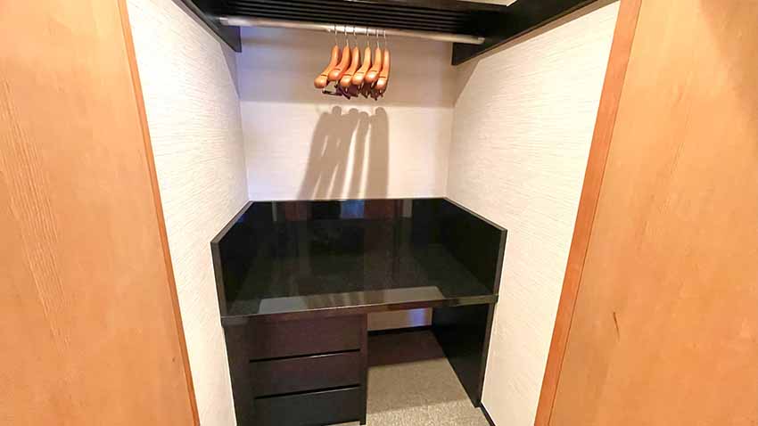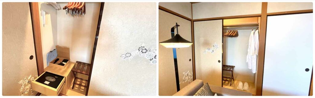 ソファー横側の押し入れは、クローゼットになっており、バスローブや金庫もここにあります。