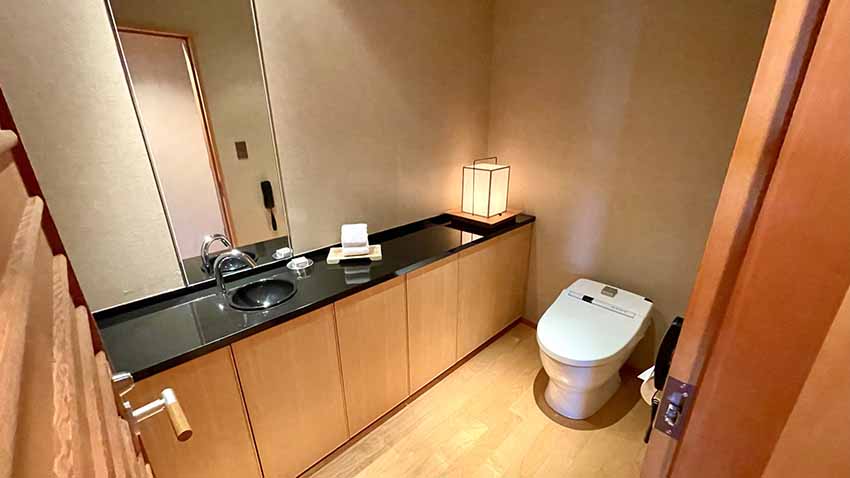 お手洗いは、ご覧のようにとても広くて、こちらも和テイストで温かみのあるデザインです。