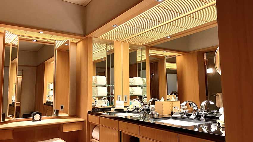 モダンジャパニーズスイートのバスルームは、玄関口からだと客室の一番奥側にあり、2シンクの洗面台とドレッサー、シャワー&浴室があります。