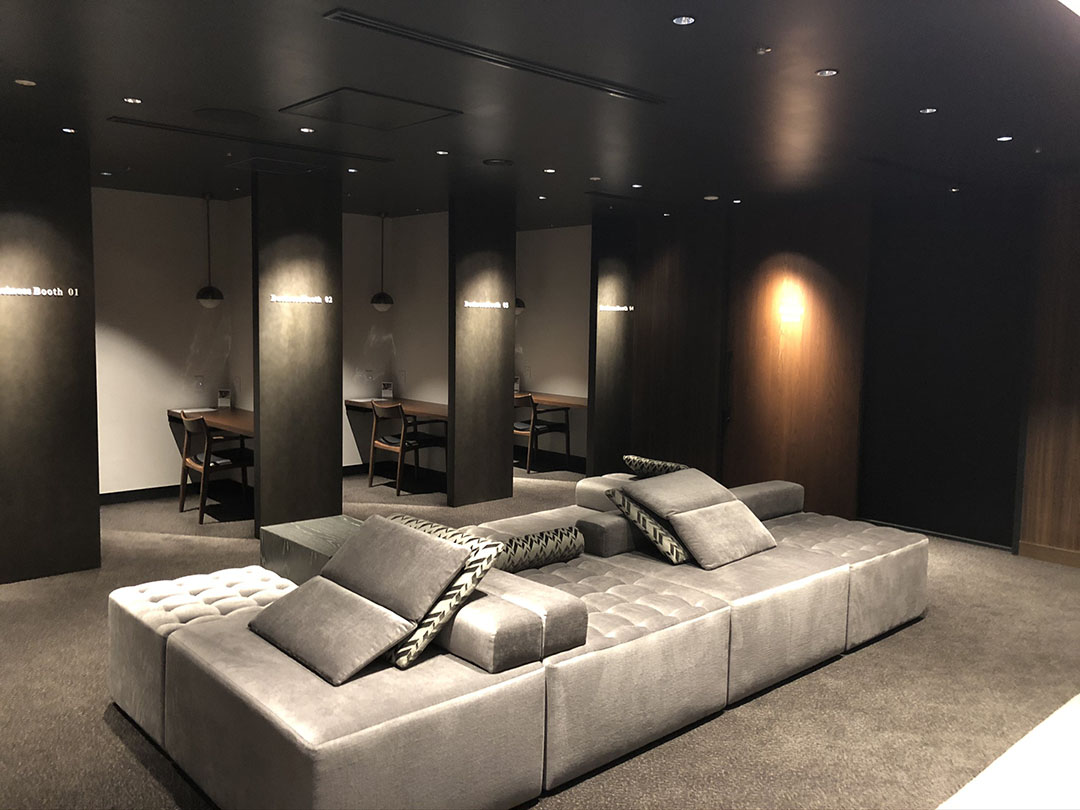 下の写真は5階にあるビジネスブースです。落ち着いた照明の間仕切りされたスペースにデスクが準備されています。また、写真の右奥は扉になっており会議室となっています。