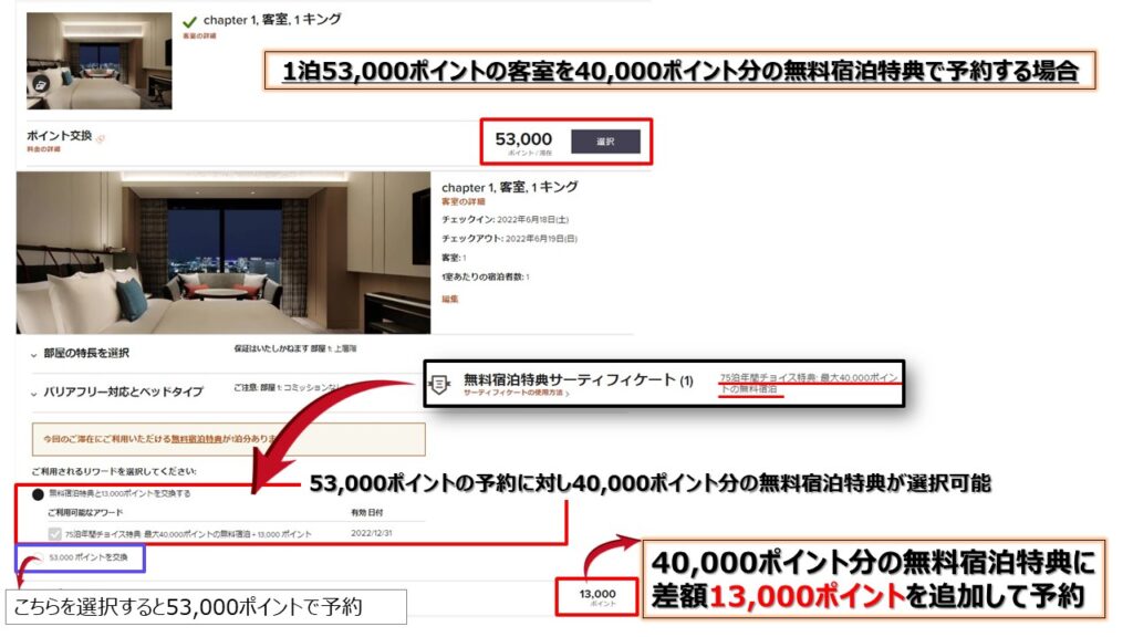 1泊53,000ポイントの客室を40,000ポイント分の無料宿泊特典で予約して、差額13,000ポイントを支払う例