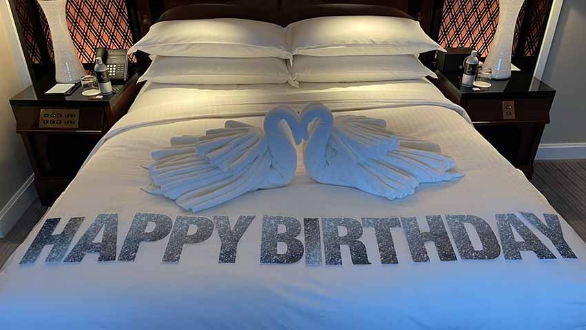 事前にお願いすれば、ベッドの「HAPPY BIRTHDAY」のメッセージや、タオルを使ったアレンジをしてもらえます。